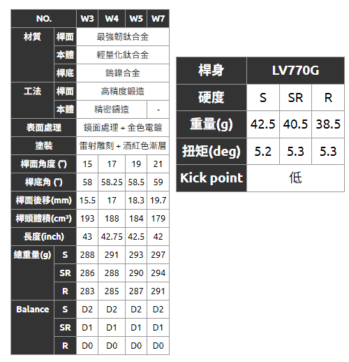 產品尺寸:Majesty Prestigio 14/Fairway/LV770碳身/#3、#4、#5 /硬度:R、SR、S