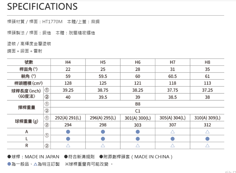 另外最新登場的球桿搭配選擇8號混血桿,在具備高初速與高彈道的混血桿系列中,新增加桿面角35度的H8號數。提供了更多元的選擇組合。