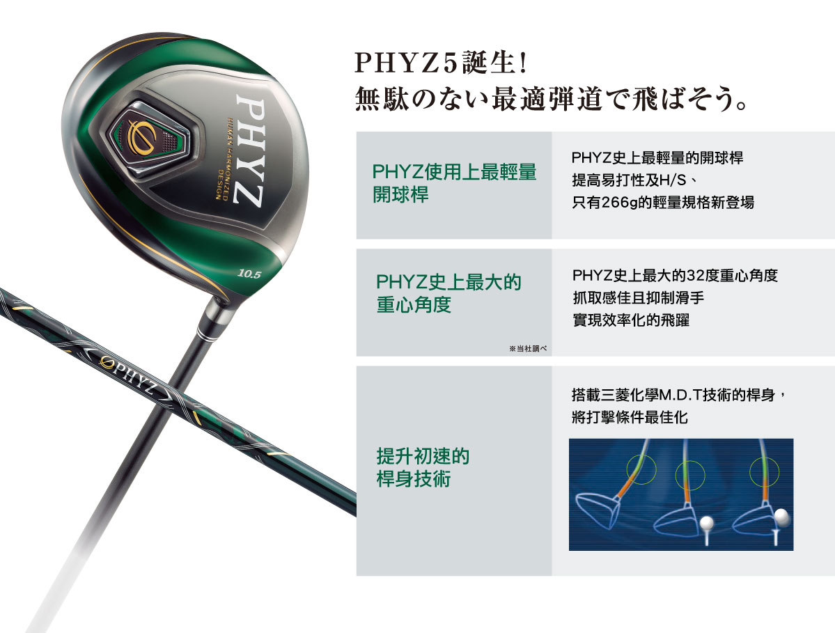 Bridgestone PHYZ 5代 球道木桿 BRIDGESTONE為世界知名的橡膠製品品牌,跨足高爾夫球具生產開發,其中高階球桿系列PHYZ廣受銀髮族球友的歡迎 PHYZ系列來到第五代,更進..